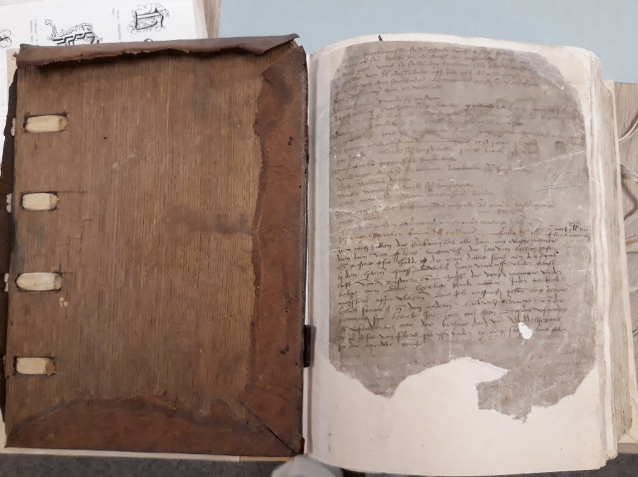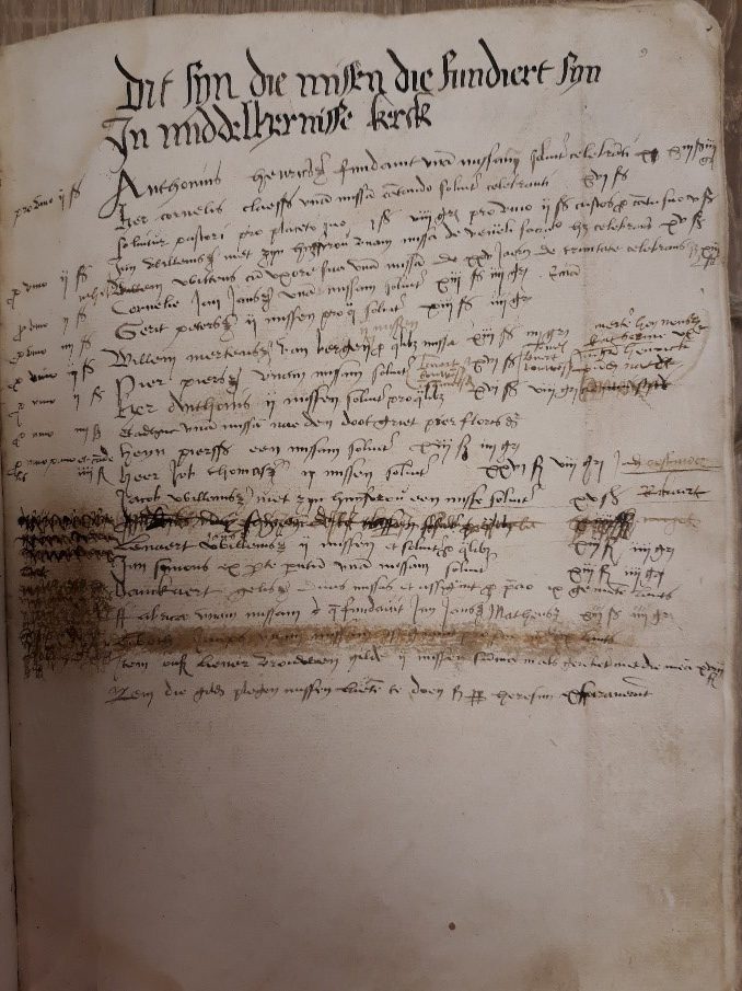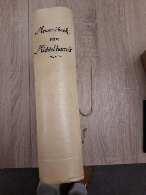 De bedijking moest voor 1 maart van dat jaar een aanvang genomen hebben. De bedijkers moesten ter ere Gods van elke honderd gemeten lands één gemet afstaan voor de te stichten kerk en twee gemeten dijkgrond voor een kerkhof. Ze waren verplicht een kerk te stichten en “ten eeuwigen dage” te onderhouden. Het dorp zou de naam krijgen Sint Michiel in Putten. Die naam is al snel in verval geraakt en vervangen door Middelharnis De bouw In de uitgiftebrief voor deze inpoldering stond dus, zoals gebruikelijk, dat er een kerk gebouwd moest worden “ ter eere Godes en zijner gebenedijder Moeder Marien in sonderlingen den heiligen Engel Sinte Michiel.” De aartsengel Michael werd beschouwd als de beschermheilige van de Meekrapdelvers en op zijn naamdag, 29 september, droeg men zijn beeld in een processie mee door de straten van Middelharnis. De uitgifte voor de inpoldering werd bevestigd door Jacoba van Beieren en Frank van Borselen in 1475. Het is dus onwaarschijnlijk, dat met de bouw van de kerk al begonnen is in 1465 en voordat het zover was moest er natuurlijk veel werk verzet worden. Een kerk bouwen was in die tijd geen geringe bezigheid. Voor grote kathedralen gold dat de grootvader bij de fundering was betrokken en de kleinzoon bij de voltooiing. Gemiddeld genomen praat je dan over een tijdsbestek van 150 jaar. Zo lang zal het hier niet geduurd hebben en bovendien wordt al 1465 een pastoor aangesteld nl. Cornelis Jacobsz. Hij legde een memorieboek aan en daaruit is dit gegeven bekend. Een memorieboek is een agenda met liturgie, een soort kerkelijke dienstregeling dus, voor het hele jaar. Ook de inkomsten en uitgaven staan erin vermeld evenals de opgedragen missen. Na restauratie ziet het boek eruit als op de linker foto. Van de oorspronkelijke kaft is de achterkant, leer over hout, nog aanwezig. (zie foto rechts) In dit memorieboek, dat zich nu in het Streekarchief Goeree-Overflakkee bevindt, is voor iedere dag een bladzijde gereserveerd, waarop bovenaan de heilige wordt vermeld, die op die dag werd herdacht ![]() ![]() ![]() ![]() ![]() afbeelding 1, waar de in de kerk van Middelharnisse kerk opgedragen missen vermeld worden. afbeelding 2, Dit is de pagina voor St. Michaël, 29 september afbeelding 3, De aartsengel Michaël die de duivel overwint. De duivel werd ook vaak afgebeeld als een draak. De kerk werd gebouwd in Gothische stijl, o.a. te herkennen aan de ramen met spitsbogen en in de traditionele opstelling: wie de kerk binnenloopt, gaat in de richting van Jeruzalem. Omdat er meer beroepen waren (verenigd in gilden), die ieder hun eigen beschermheilige hadden, werden er ook voor die heiligen altaren gebouwd: voor St. Anthonius, beschermheilige voor de melaatsen en door de boeren aangeroepen bij ziekten van het vee; voor het Heilig Kruis en St. Petrus, de beschermheilige van de vissers; voor St. Jacob, de beschermheilige van de zeevaarders; voor St. Joris, de beschermheilige van de schutterij; voor St. Gertrudis, de beschermheilige tegen muizenplagen, koorts en andere ongemakken. Zij was zeer populair bij de boeren, omdat hun oogst vooral in droge zomers veel te lijden had van de muizen.