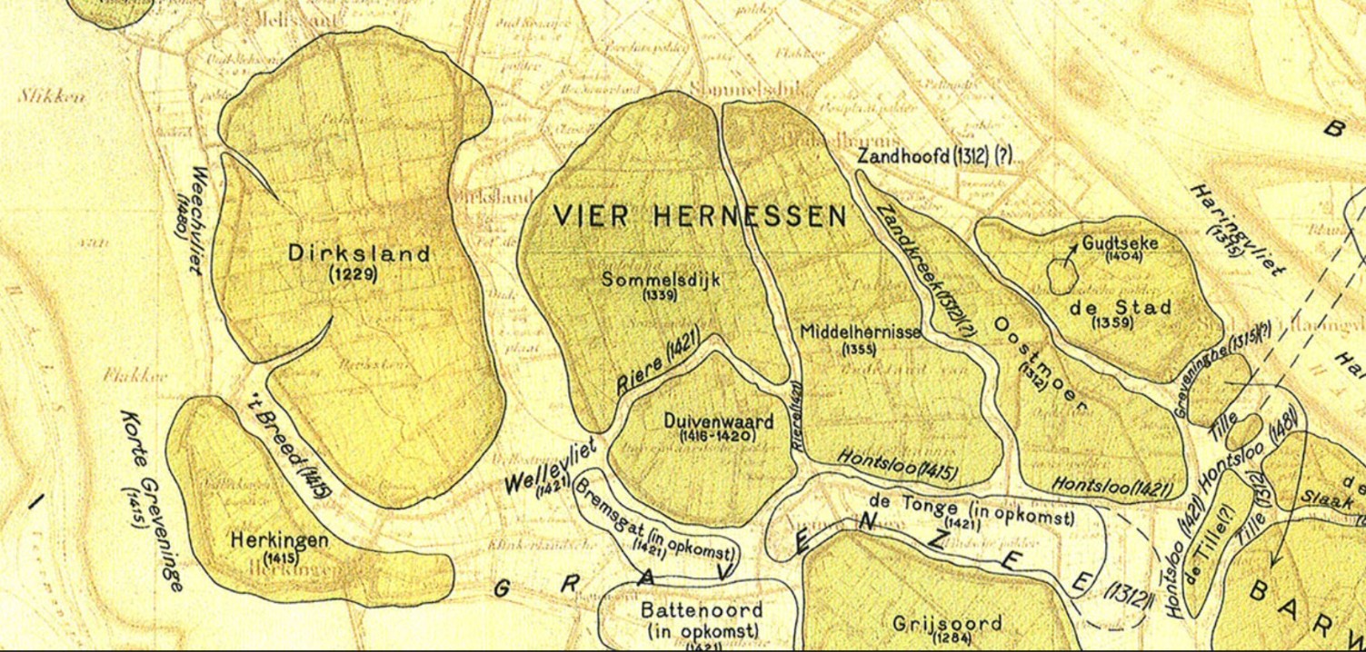Jacob van Lennep Wat vooraf ging. “Op! Mannen van Middelharnis! Ter hulpe! Ik ben Willem van Holland. Het hooren van dien geduchten naam, – maar nog meer wellicht de tegenwoordigheid van de gewapenden, die den Graaf vergezelden, – ontstak de moed der dorpelingen: van alle kanten drong men op de volgelingen van Meerhem aan, en hij zelf vond zich ontwapend en gebonden, eer hij nog tijd had gehad, zich te weer te stellen”. Deze passage staat in de bijdrage van Kees Dirksz als onderdeel van het verhaal De reisgenoten, geschreven door Mr. Jacob van Lennep. Het verhaal de Reisgenoten komt voor in deel 5 van de serie Onze Voorouders in verschillende taferelen geschetst, (1844). Die reisgenoten horen bij het gezelschap van Jonker Johan van Arkel, hoofd van de Friese Kruisvaarders, op terugtocht na de laatste kruistocht in 1270. Van Lennep laat daarmee de historie van Middelharnis beginnen voor het jaar 1270 omdat er in het verhaal al sprake is van een marktplein en een haven. De Heer van Putten is de verbindende schakel tussen fantasie en werkelijkheid. Het begin Op 1 maart 1312 bevestigde Graaf Willem II van Holland een paal- of grensscheiding van de heerlijkheid Putten. Volgens de beschrijving liep die tussen de vier hernessen, of hornessen. Daarmee worden de weiplaten, of anders gezegd de eigendommen of erfgoederen bedoeld. Voor één van de middelste platen, de middelhernesse, gaven de heer en vrouwe van Putten op vrijdag na Sinte Margriet, 17 juli 1355, aan Hugo Willemszoon van Zwanenburgh vergunning om 60 gemeten moerdijken te verkopen die voor zout- en turfwinning geëxploiteerd zouden worden. Op 16 juni 1430 kreeg Adriaan Willem Hugeszn., zoon van Zweder van Gaesbeek, heer van Putten, de helft van het gehele Middelharnis in leen, met dien verstande, dat Adriaen, wanneer hij tot verkoop wilde overgaan, hij dit zou moeten overleggen met de heer van Putten. Van de opbrengst zou de heer de vierde penning moeten hebben. Adriaen Willem Hugeszn. is zonder zonen na te laten overleden en Middelharnis verviel weer aan de heer van Putten. 8 december 1415 verkocht Jacob van Gaesbeek, onder een aantal bepalingen, 20 gemeten moerdijk aan Heinrich Wael, Jan van Delft en Gheryt Janszoon voor 18 kronen en op 12 juli 1424 verkocht hij de gorzen van Middelharnis. Hieruit blijkt dus dat Middelharnis de helft is van het latere Oudeland van Middelharnis.
