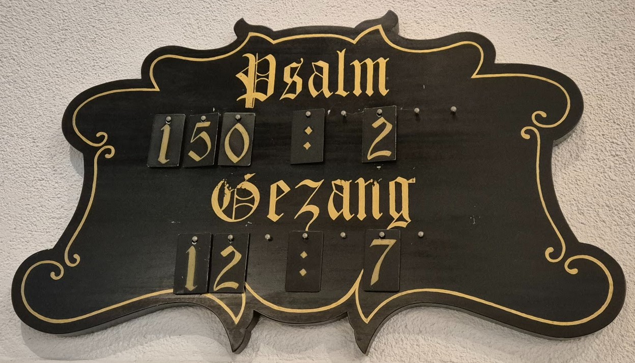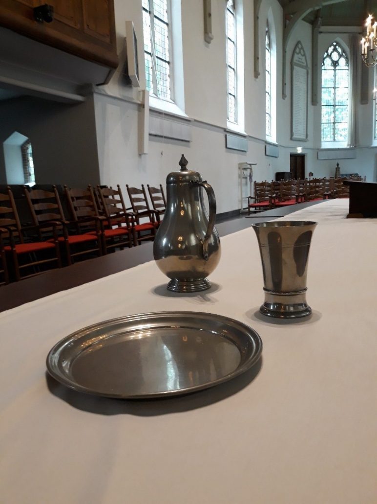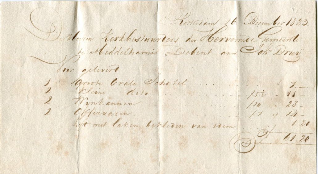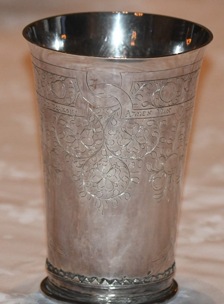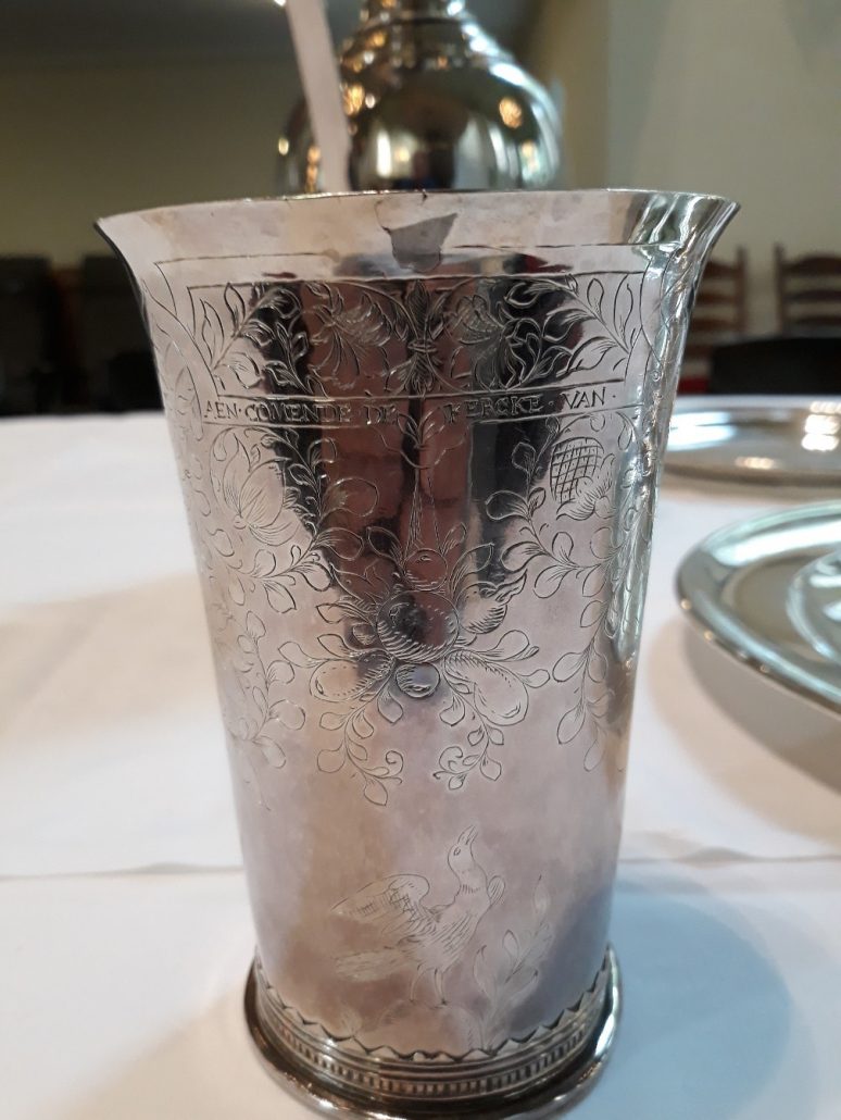 1e afbeelding: Het Avondmaalsstel dat nog steeds gebruikt wordt en gemaakt is van zilver bestaat uit een oud en een nieuw gedeelte. De linker schalen, licht gebutst door het eeuwenlange gebruik, zijn dus ouder dan de rechter. 2e en 3e afbeelding De zilveren bekers zijn gemaakt door de meester zilversmid Adam de Swaen uit Rotterdam. Het ene stel is van 1640, het andere van 1641. De kerkenraadshandelingen van dat jaar ontbreken, evenals de rekening van de kerkvoogdij, zodat de exacte datum van aankoop niet is te traceren. De bekers zijn gegraveerd met bandwerk, vogels en bloemen. Op twee bekers staat de tekst: AENCOMENDE DE KERCKE VAN MIDDELHARNAS. Op de beide andere bekers staat: AENCOMENDE DE DIAKONY ARMEN VAN MIDDELHARNAS ![]()