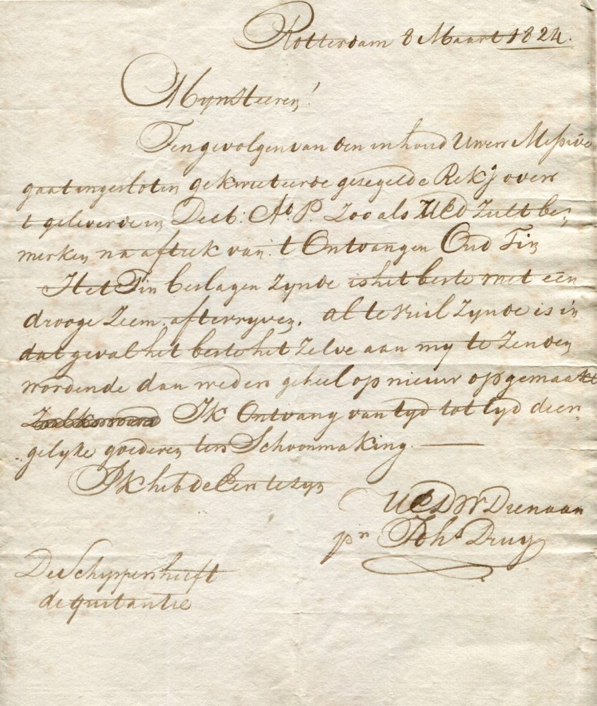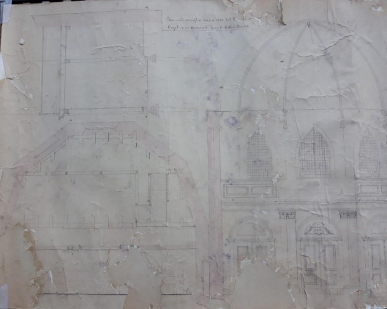 Ter nagedachtenis aan een latere predikant, Lucas Slotenmaker, is een gedenkteken gemaakt aan de oostzijde van de kerk, nu naast de zij-ingang richting Voorstraat. Het gebeurde op initiatief van zijn vrienden en de afdeling van de Maatschappij tot nut van het algemeen. Op de piramide, die op een voetstuk staat, is de volgende tekst gebeiteld. Aan Zijne Nagedachtenis ___ Zijne vrienden en de Afdeling der Maatschappij Tot Nut van ’t Algemeen Middelharnis en Sommelsdijk Op het voetstuk staat: Lucas Slotenmaker Overleden den 13 maart 1821 Het stoflijk deel een ’s wakk’ren leeraar’s Dekt deez’ aarde, Van velen vaak miskend en niet geschat Naar waarde Hij was geleerd, begaafd, en stichtelijk Van leven; Zijn loopbaan was voleind; God wou hem D’ eerkroon geven. Nieuw Avondmaalstel In 1823 wordt bij Johannes Druij, meester tinnegieter te Rotterdam een nieuw tinnen Nachtmaalstel besteld: 1 grote schotel, 2 kleine schotels, 2 wijnkannen en 2 offervazen, alles met laken bekleed aan de onderkant. Het geheel wordt door de schipper afgeleverd bij de secretaris van de kerkvoogdij, secretaris Nijgh, naar wie de Secretaris Nijghstraat is genoemd. Een ander lid van de kerkvoogdij stuurt vervolgens in maart 1824 een tinnen kan, een grote schotel en vier kleine schotels als oud tin dat niet meer gebruikt wordt naar Johannes Druij met de vraag om de waarde van het oude tin af te trekken van de rekening. Dhr. Druij schrijft nog ( 8 maart 1824) dat de offervazen niet uit één stuk zijn, maar dat de bovenstukken er af te nemen zijn, waardoor het geld later gemakkelijk eruit te halen is.. Het schoonhouden moet met een droge doek gebeuren en mocht het oppervlak smerig worden dan moet het geheel “opgestuurd worden en hij zal er dan voor zorgen dat alles opnieuw opgemaakt wordt”. Vervolgens wordt een orgel gekocht. Dat werd geplaatst op een galerij tegen de achtermuur voor het middelste raam van het koor en zodanig dat het orgel precies voor het middelste raam stond. Zie onderstaande afbeeldingen. afbeelding 1 :Interieur voor 1904. Het orgel staat achterin het koor op een kleine galerij die daar speciaal voor gebouwd was. afbeelding 2:Bouwtekening van het orgel. afbeelding 3:Bouwtekening van de galerij waarop het orgel geplaatst zou worden. | ||
