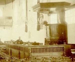 In 1657 wordt op, bevel van de overheid, tegen de kerk de consistorie gebouwd. Op deze foto uit de periode voor 1904 is links die consistorie te zien. Er was hier ook een ingang in het koor. De preekstoel met het nieuwe hek voor de tuin komen er in 1686 bij. Deze preekstoel en het hek rond de tuin ( de ruimte voor de preekstoel) hebben bestaan tot de brand van 1904. Hier zit de toenmalige koster J. van Klink binnen het hek rondom de tuin. In 1730 wordt de vloer in de kerk hersteld, worden banken en stoelen verplaatst en de vloer in het portaal verlegd. In 1733 wordt een bijbel met koperbeslag gekocht om bij tijd en wijle op de kansel te leggen. Er worden ook twee borden gemaakt ter nagedachtenis aan Nicolaas Magerius die van 1663 tot 1718 predikant te Middelharnis was. De borden worden aan weerszijden van de preekstoel opgehangen. Het bord aan de rechterkant bevatte een Latijns gedicht, gemaakt door Sigbertus Haverkamp, predikant te Stad aan het Haringvliet, die dit maakte na de dood van Nicolaas Magerius in april 1718. Aan de linkerkant werd het bord met de dichterlijke vertaling door F. Vaster opgehangen. De vertaling is: Overleden april 1718 Een’ dappren held, een’ krijgsman, door de jaren Van ligchaamskracht, doch niet van moed, beroofd, Zag m ‘eertijds gunst en glorie wedervaren. Men schonk hem eer en rust, men gaf hem have en goed Als vruchten van zijn’ dienst en van zijn strijdb’ren moed. Nooit streed, maar meer dan vier en vijftig jaren Het harnas droeg in Middelharnas kerk, Der hel ten schrik, om ’t Godsrijk te bewaren, Niet met veel grooter regt, na zulk een’ langen strijd, De rust voor ’t zwakke vleesch, een’ kroon voor trouwe vlijt? O Ja! Zijn veldheer hoorde en riep hem van beneden, En schonk hem eeuwig rust in ’t rijk der zaligheden. F. Vaster transtulit, 1765